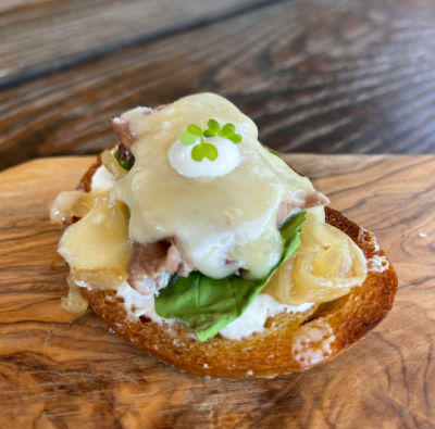 Succulent strip steak crostini layered with black garlic and sweet caramelized onion, finished under a blanket of Gruyère. The perfect partner? Capo Creek’s Open Mic Red Rhône Blend, whose savory, aromatic layers echo the dish’s rich umami depth. Chef Mary’s longtime love of black garlic shines here, delivering a flavor finale your guests won’t forget. (the puree is available from Amazon).